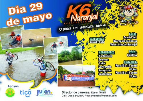 La segunda “ECOAVENTURA JUVENIL K6 NARANJAL- EDICION 2011” decretada de Interés Municipal será un evento direccionado al publico joven, dividido en dos categorías, JUNIOR y JUVENIL. Que recorrerá sitios del interior de nuestro distrito con una distancia de 40-km y 60-km respectivamente, con un diseño atractivo y desafiante adecuado a las categorías propuestas, la carrera será a nivel nacional, y cuenta con el apoyo del Club de Corredores de Aventura. A desarrollarse los días 28 y 29 de mayo del 2.011. A continuación algunos detalles de la carrera: